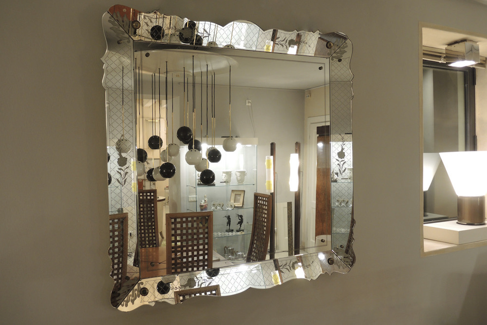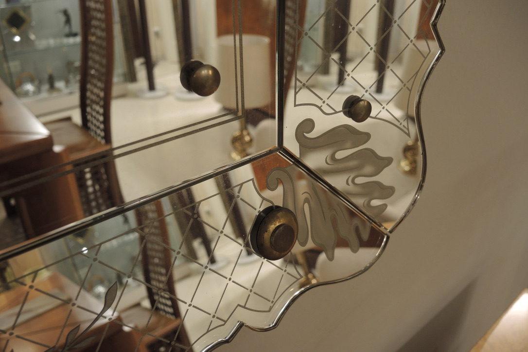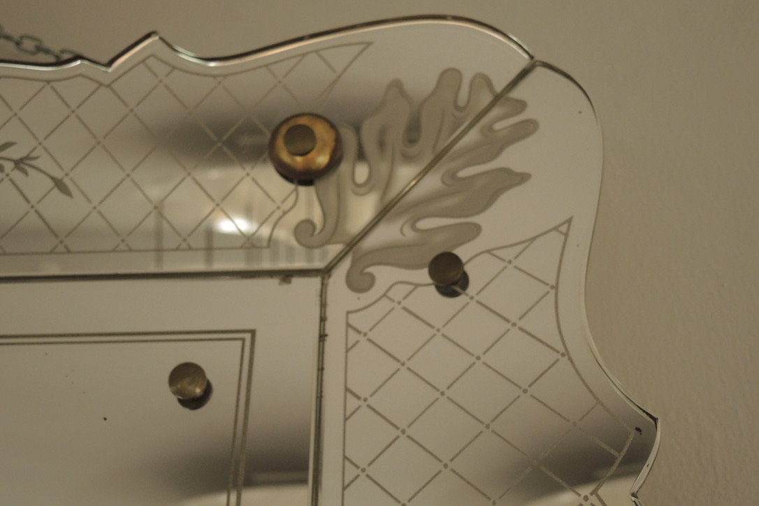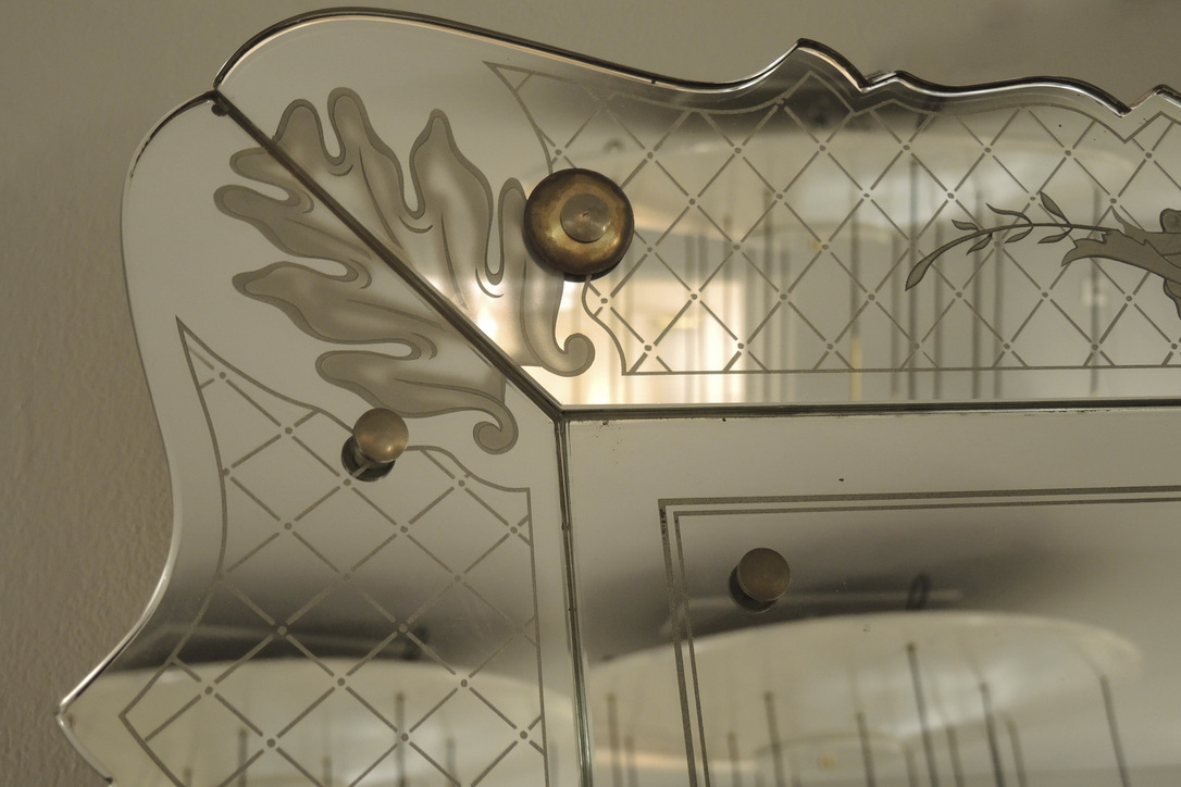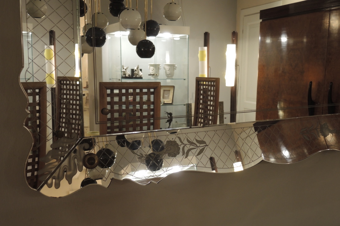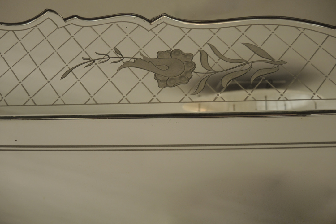 Grande specchiera realizzata a disegni fitomorfi con la tecnica della sabbiatura durante gli anni 40.