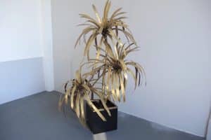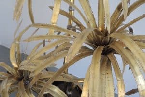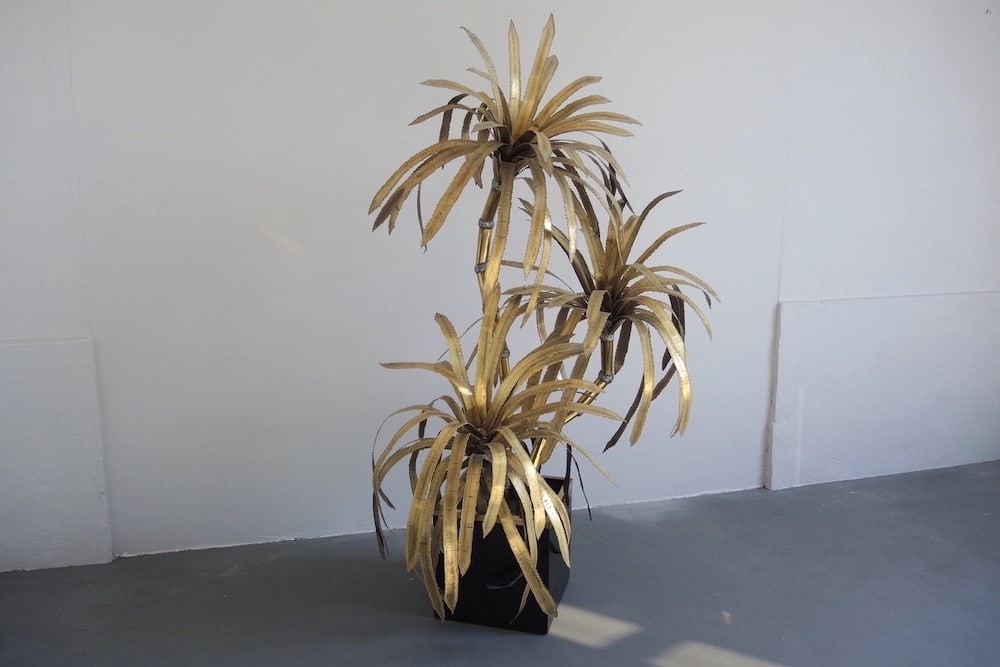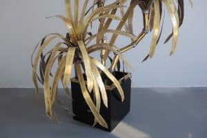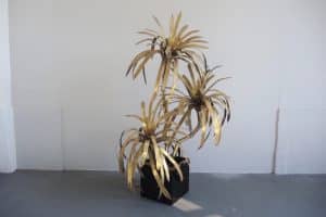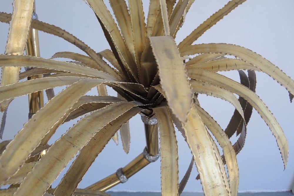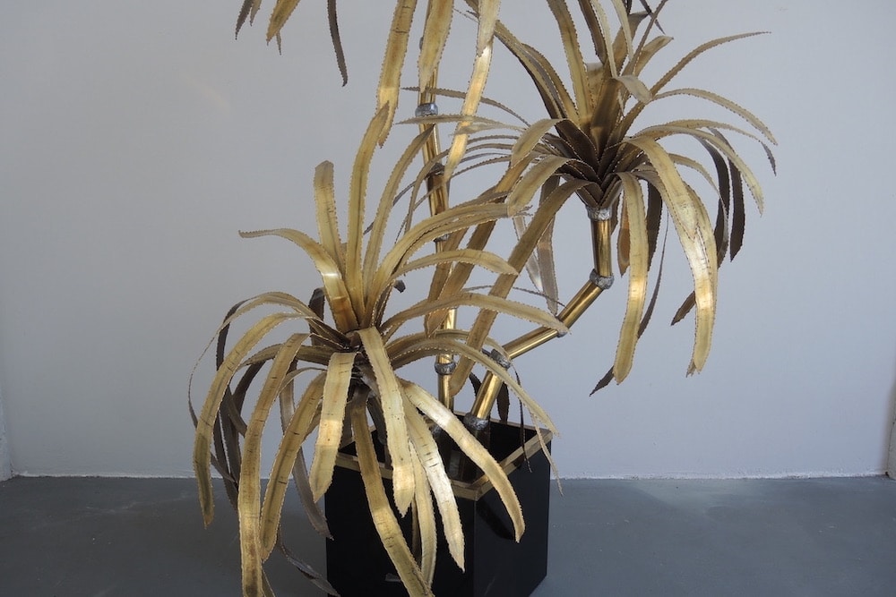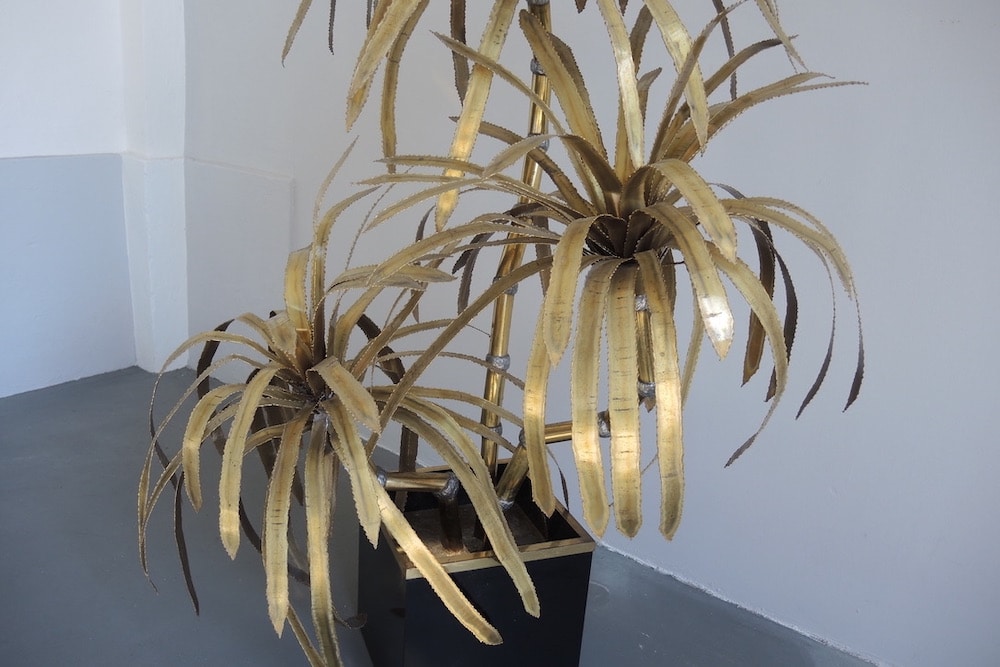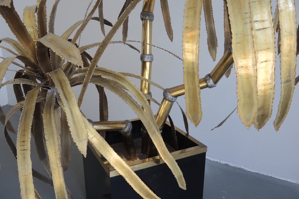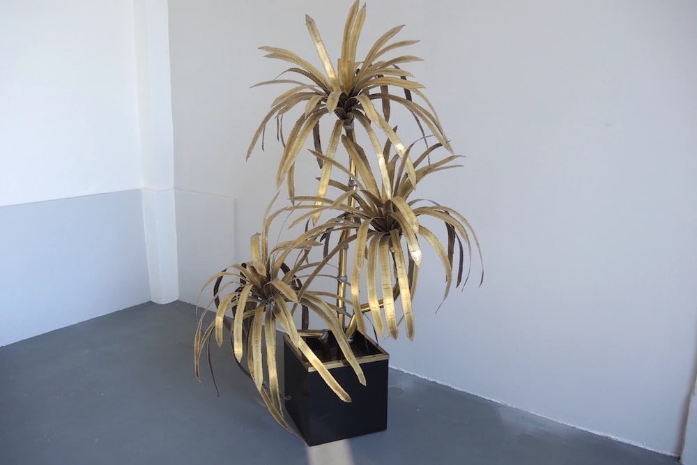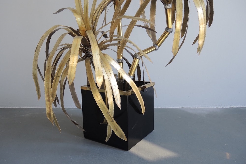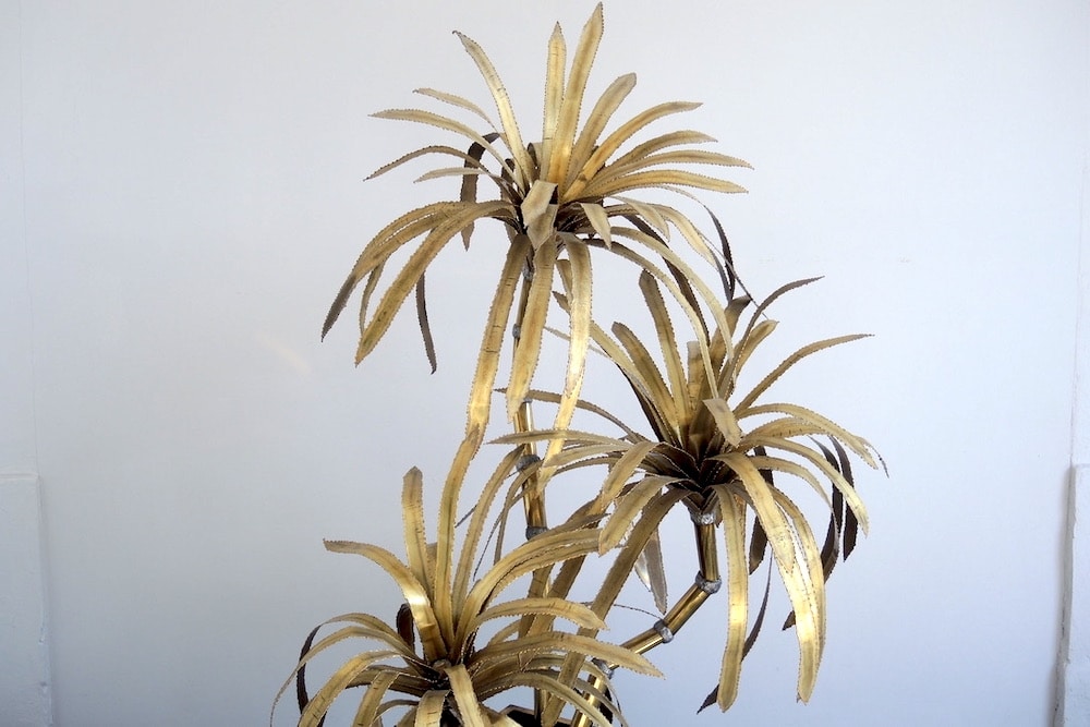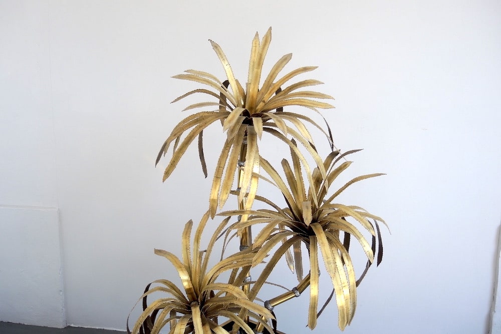 Rara scultura in ottone realizzata durante gli anni 70 dalla Maison Jansen ditta parigina che durante tutto il 20 Secolo ha prodotto cose particolarmente eclettiche ed inusuali..queste piante nelle varie versioni vennero prodotte per arredare negozi e case.La scultura misura 180 cm di altezza e 38cm x 38 cm la base