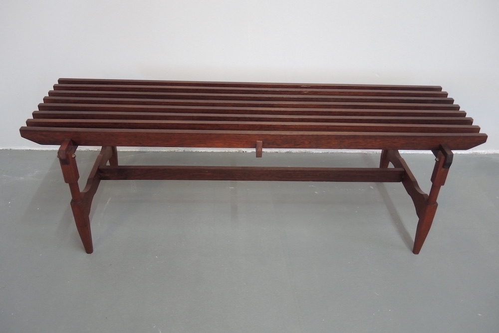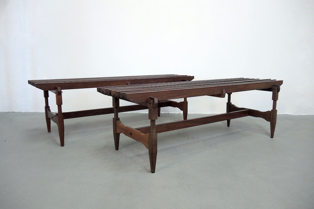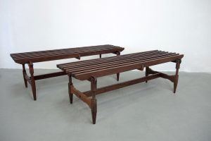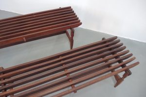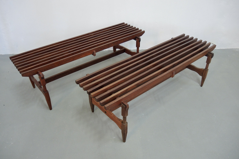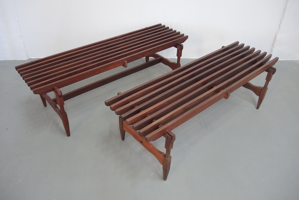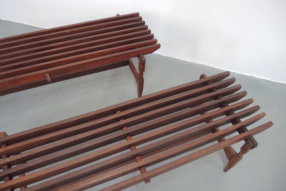 Rara coppia di panchette in legno degli anni 60 realizzate probabilmente da Ico Parisi.Hanno un bellissimo disegno che ricorda il periodo della grande industria con incastri bulloni.Misurano 120 cm x 42 cm x 42 cm di altezza