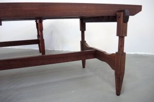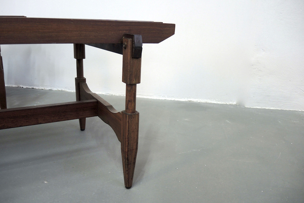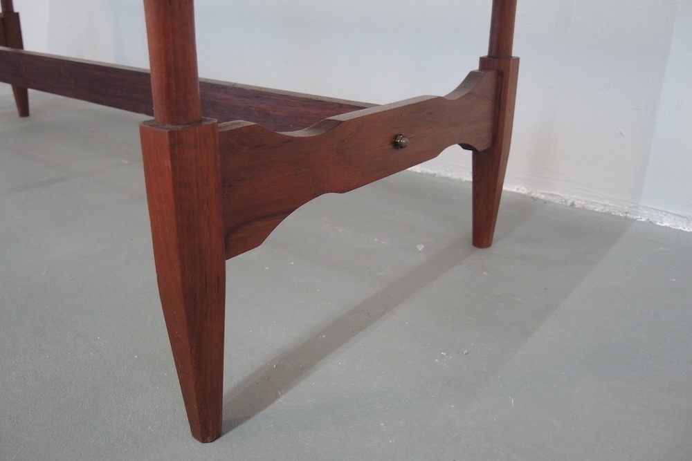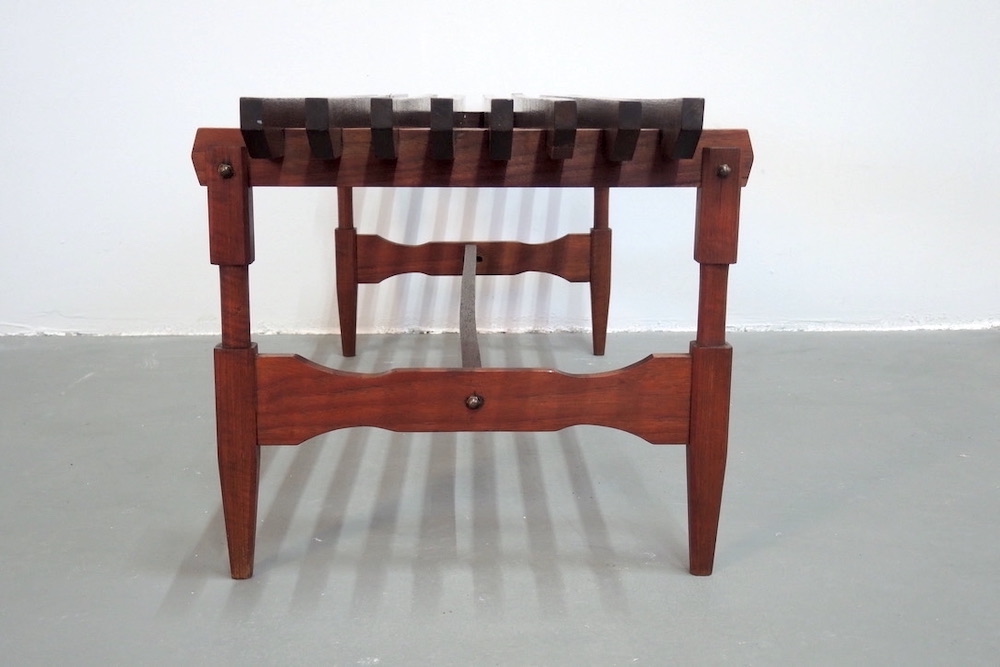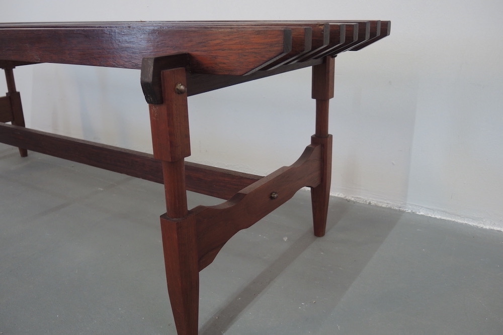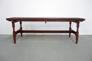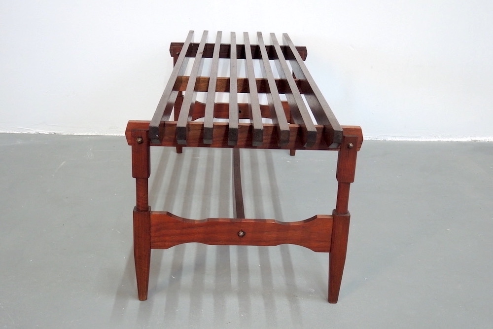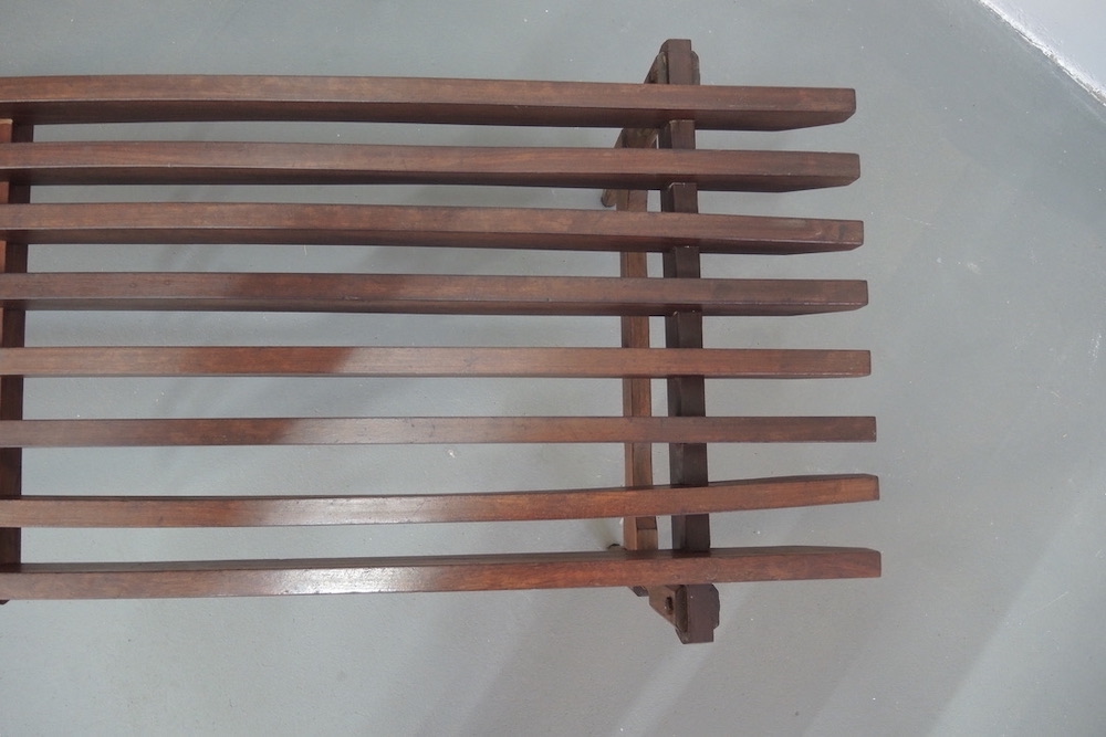 Rara coppia di panchette in legno degli anni 60 realizzate probabilmente da Ico Parisi.Hanno un bellissimo disegno che ricorda il periodo della grande industria con incastri bulloni.Misurano 120 cm x 42 cm x 42 cm di altezza