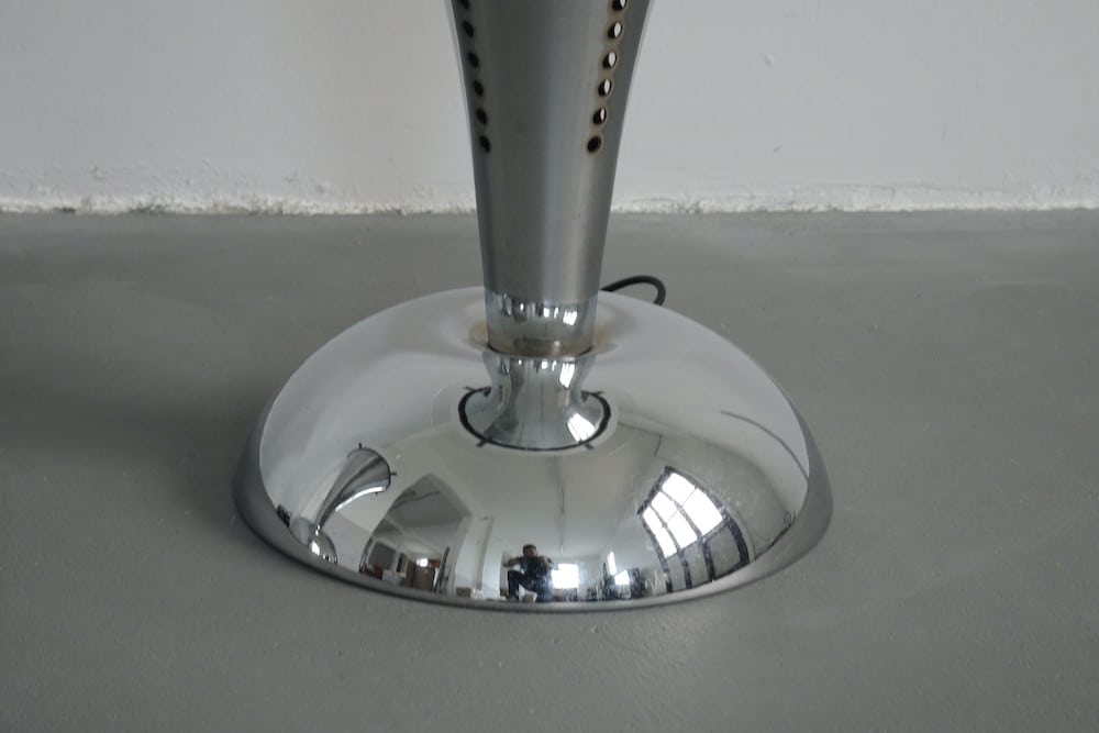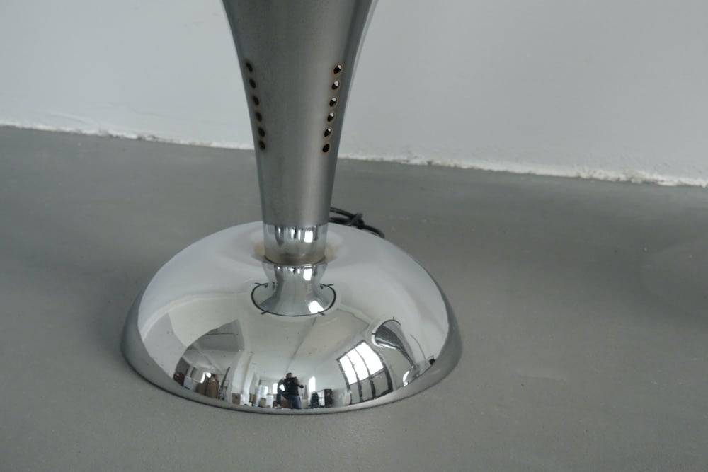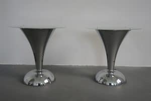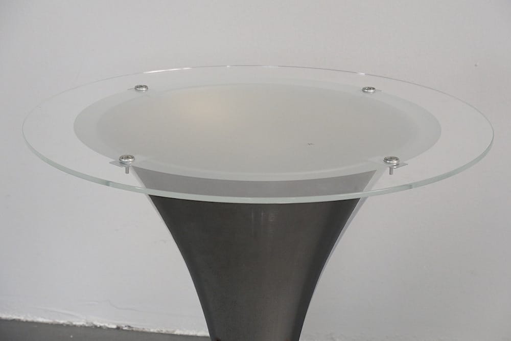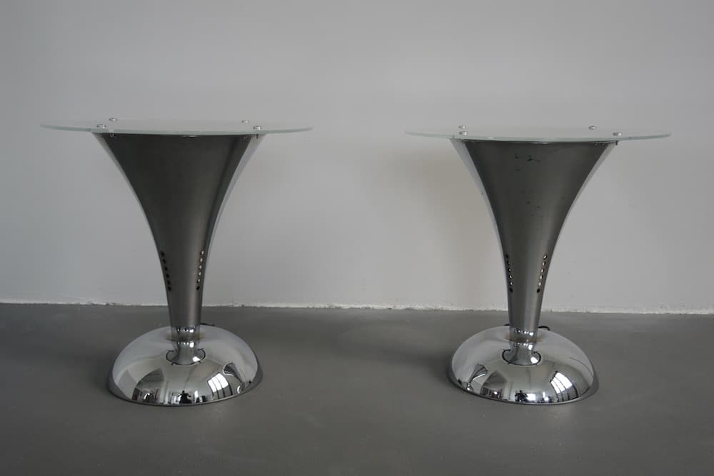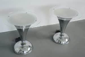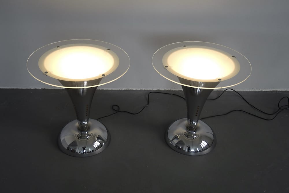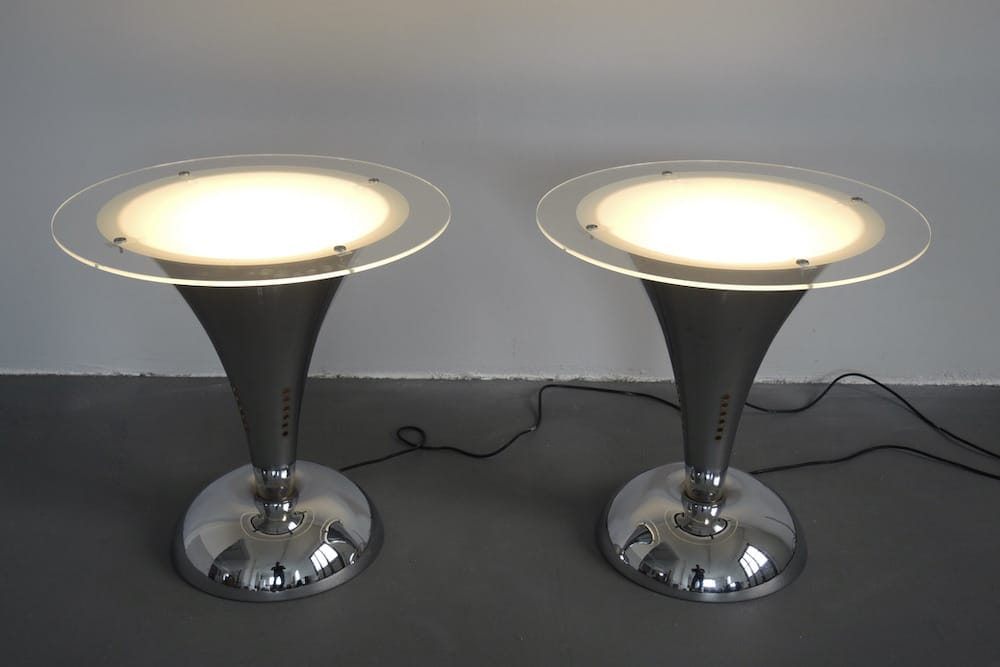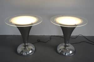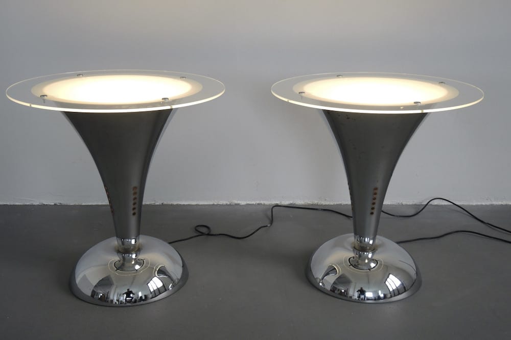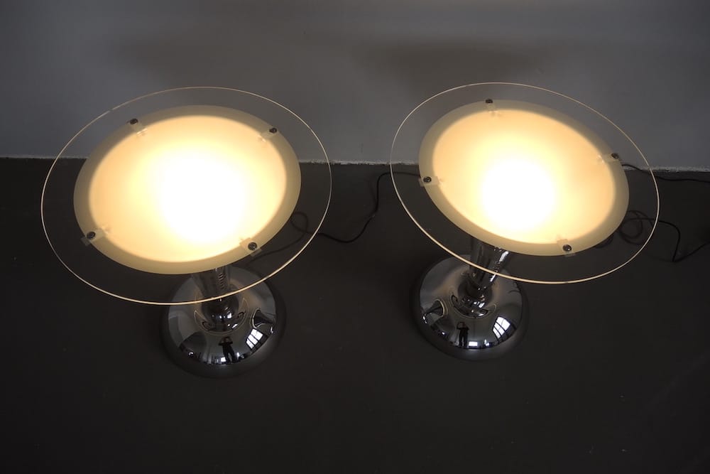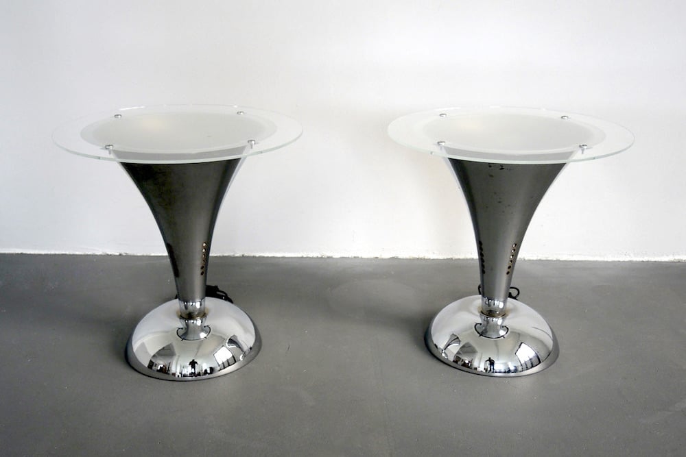 Coppia di tavolini Space Age degli anni 70 in acciaio e vetro satinato.La particolarità è l illuminazione e si possono utilizzare anche come comodini.Misurano ….