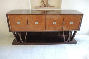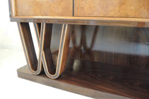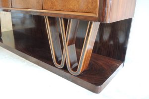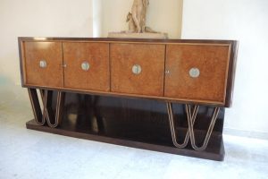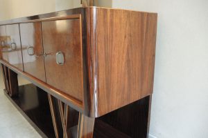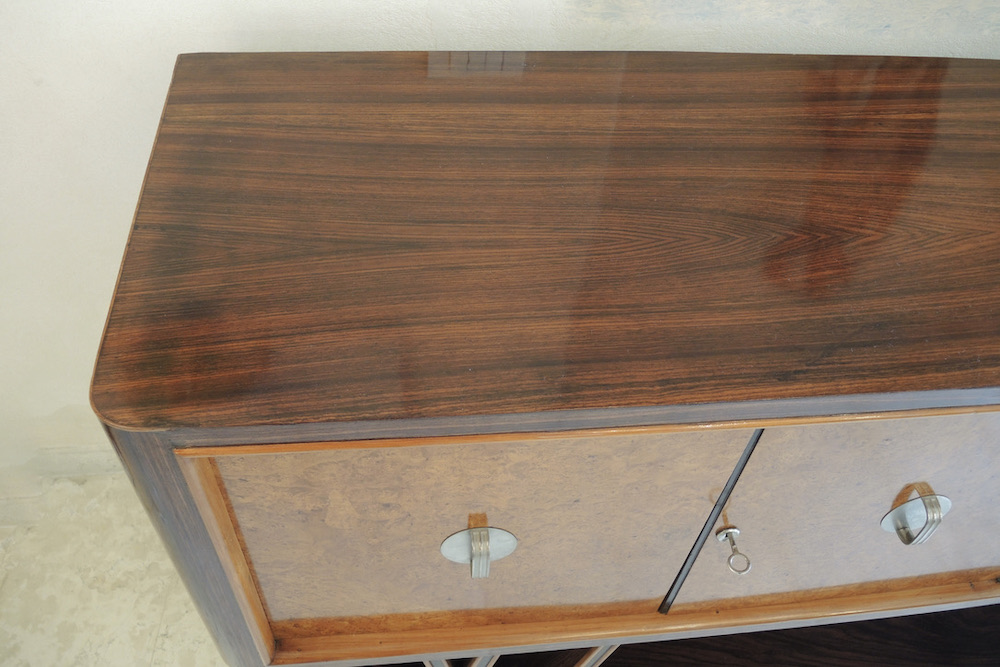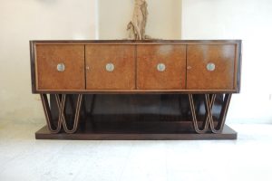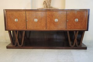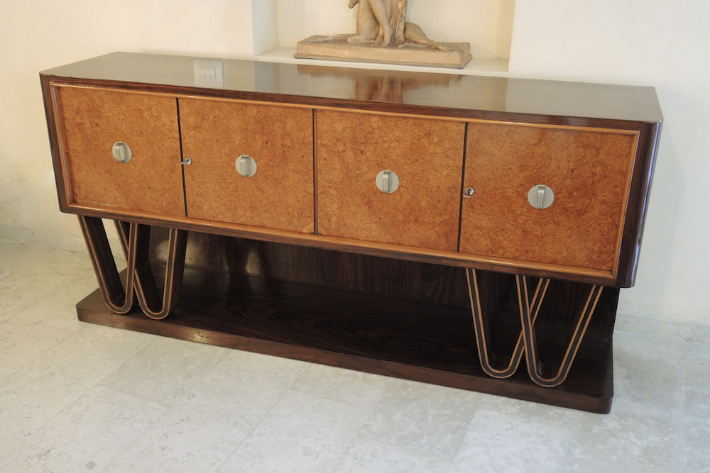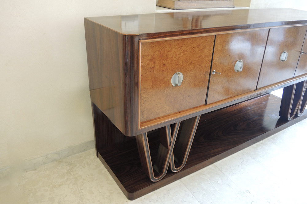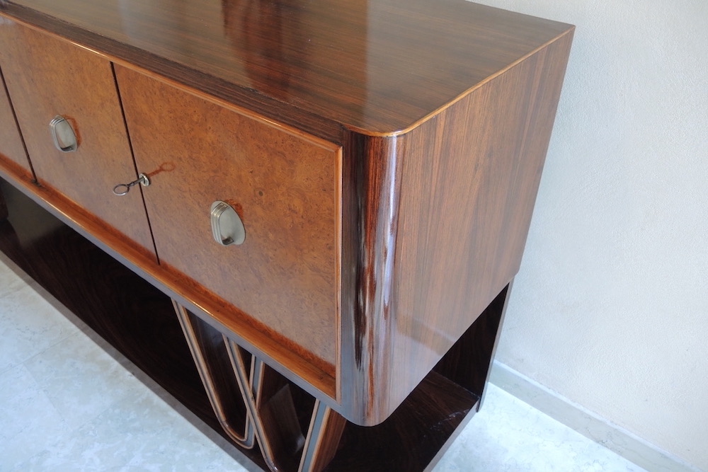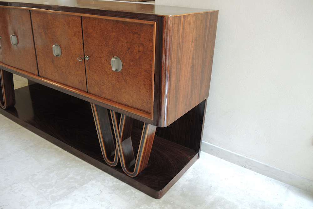 Raffinata credenza degli anni 30 in  radica di tuya e palissandro realizzata sicuramente nell’ interland milanese da uno degli atelier più importanti dell epoca come Borsani Dassi..Bellissima la forma con maniglie in ottone e base sinuosa..Misura 200 cm x 50 cm x 95 cm di altezza