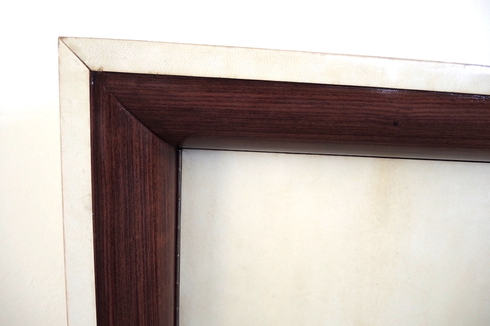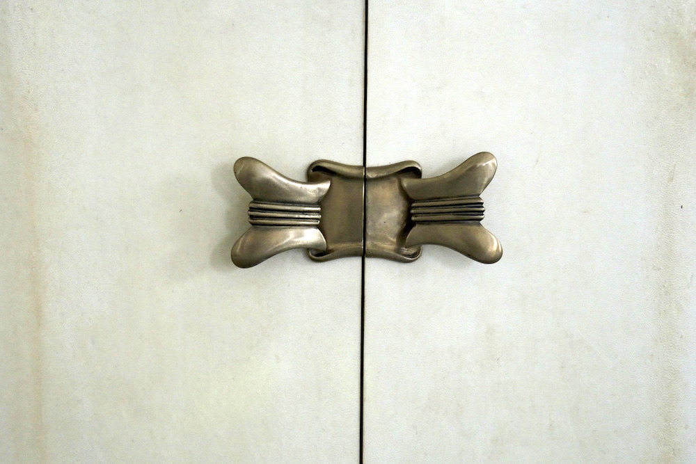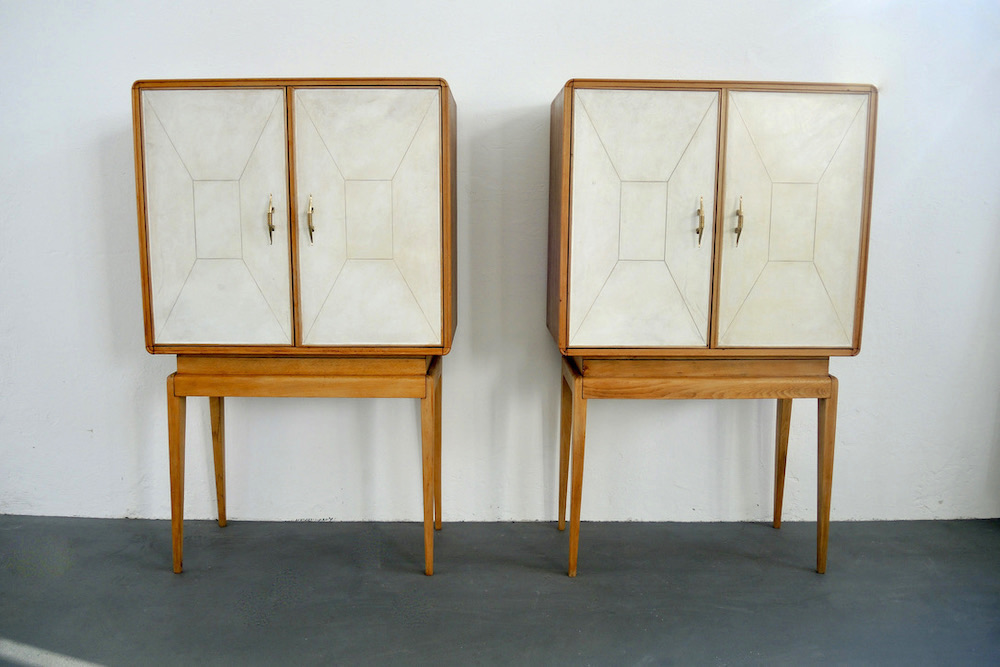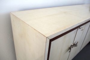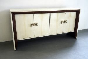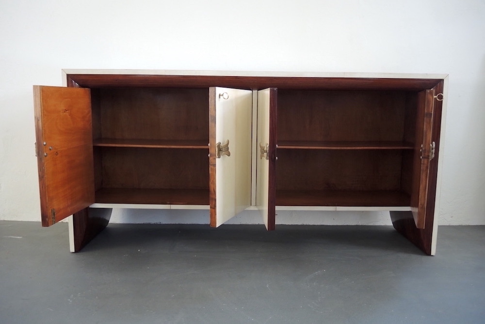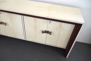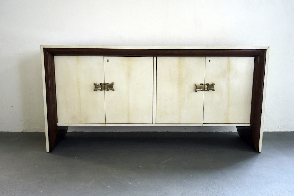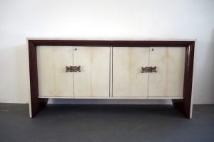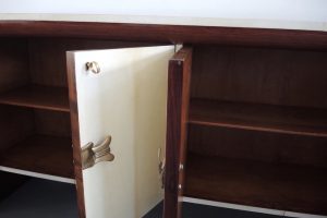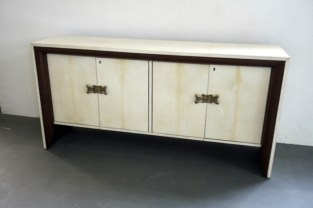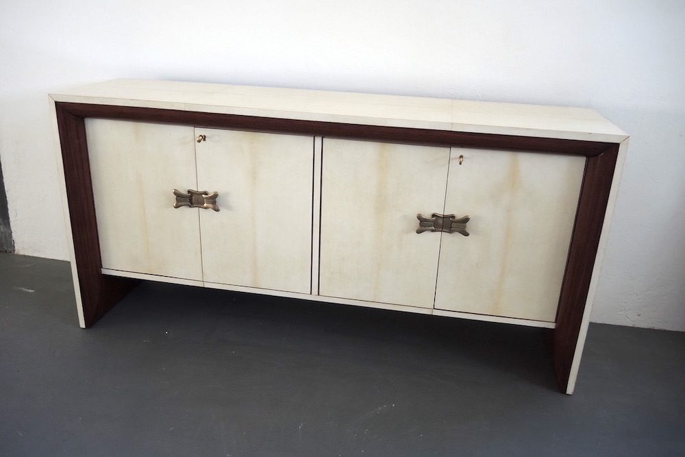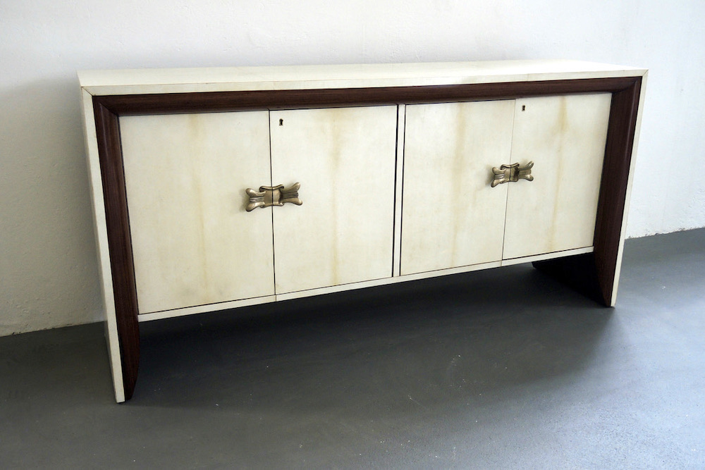 Rara credenza realizzata durante gli anni ’30 in palissandro e pergamena sicuramente dall’atelier di Osvaldo Borsani per le tipiche maniglie in ottone fitomorfe.La credenza, di grande qualità, misura 200 cm di larghezza, 50 cm di profondità e 95 cm di altezza.