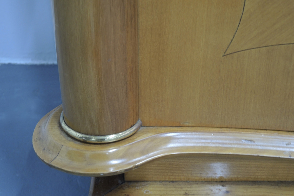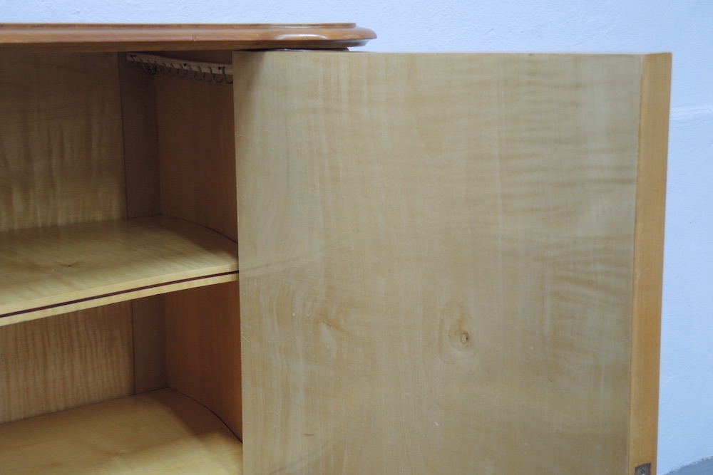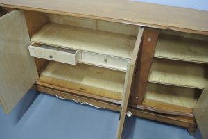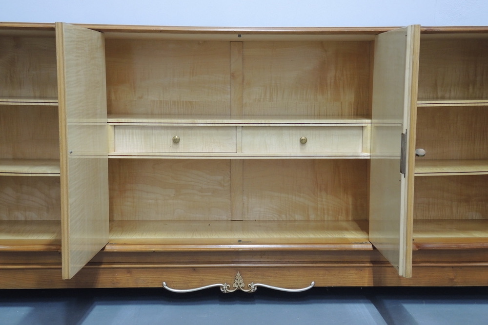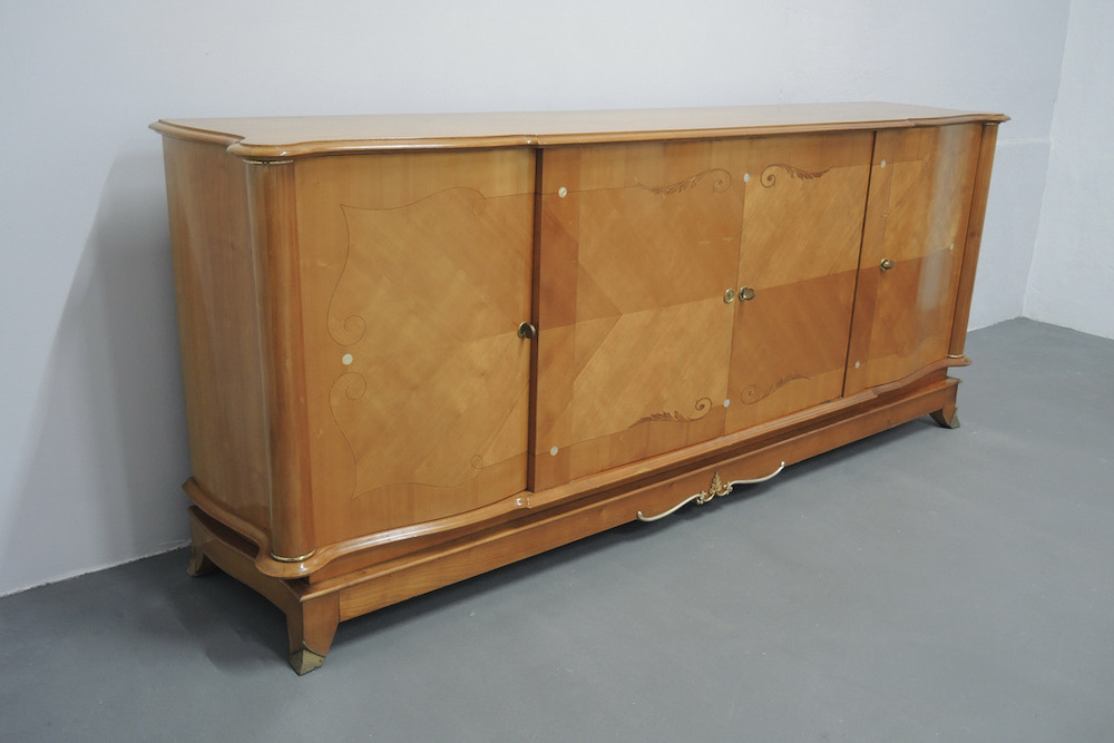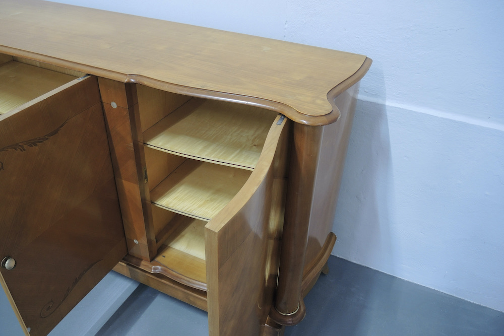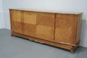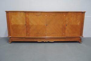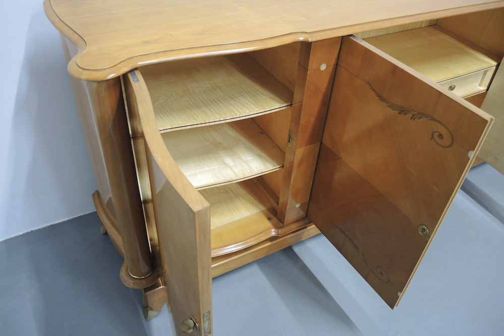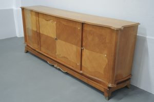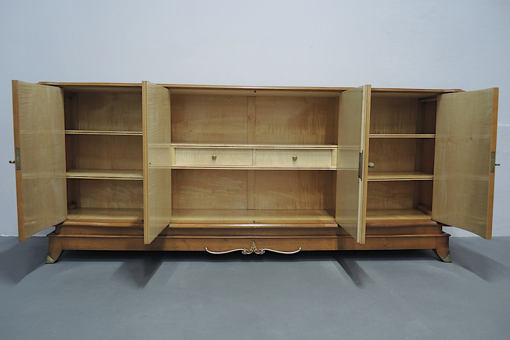 Rara credenza francese realizzata durante gli anni 40 dal designer francese Jules Leleu in legni pregiati di Sicomoro acero inserti in ottone .In legno massello aprendo gli sportelli abbiamo un interno prezioso in acero e tarsie di vari legni.Misura ……