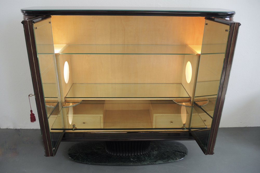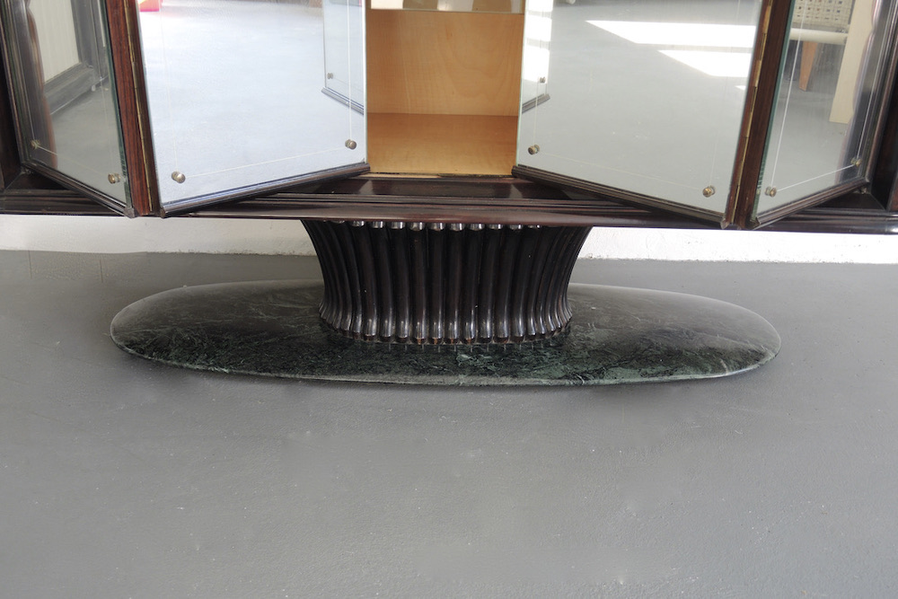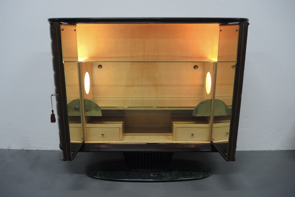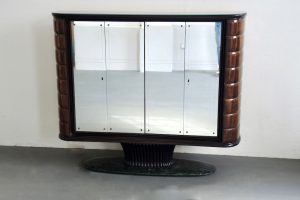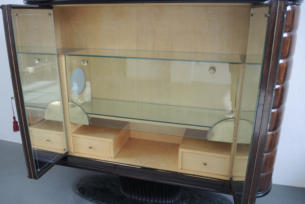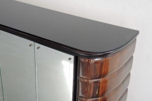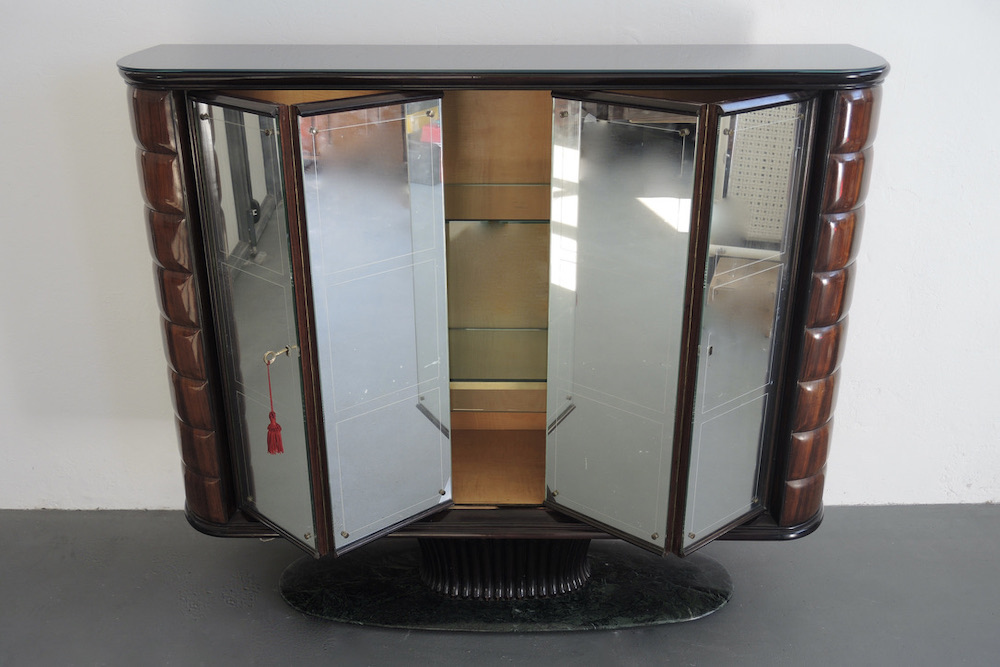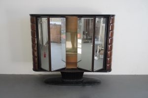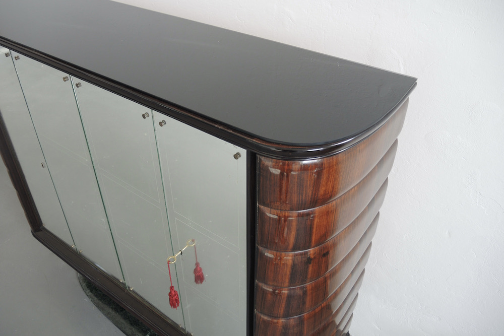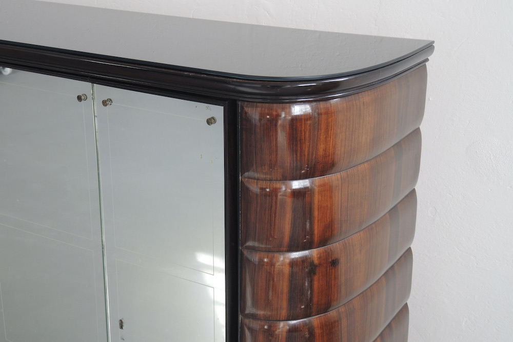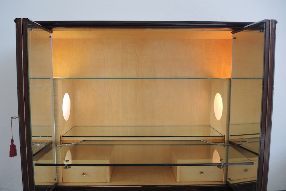 Raro mobile bar realizzato dalla ditta Dassi Milano durante gli anni 40.Mobile di gran qualità costruito su struttura in massello e rifinito in Palissandro.. specchi con decori acidati vetro opalino sul top.Le porte si aprono a soffietto con un interno interamente in acero illuminato con porta in vetro spessa che si apre a ribalta e rimane da appoggio su grosse cerniere in ottone.Misura 153 di larghezza 130 cm di altezza..profondità 45 cm