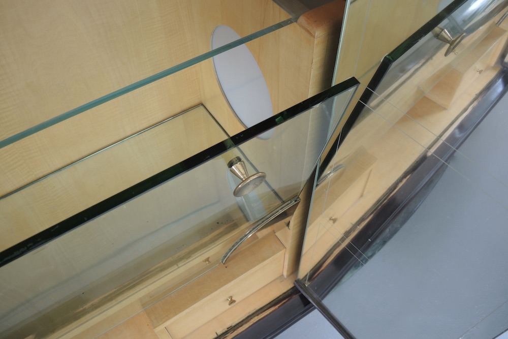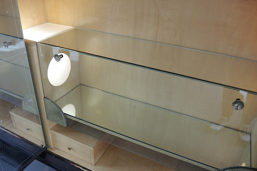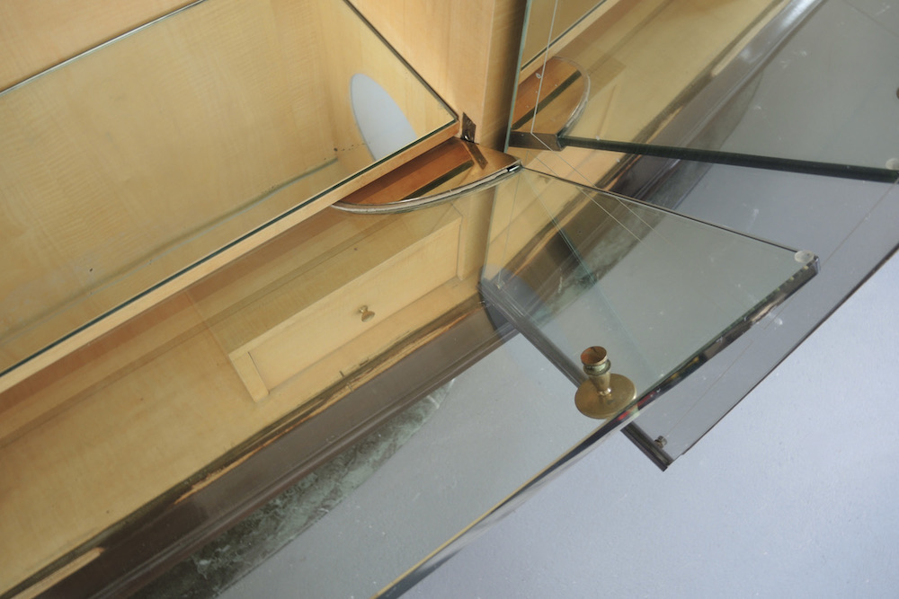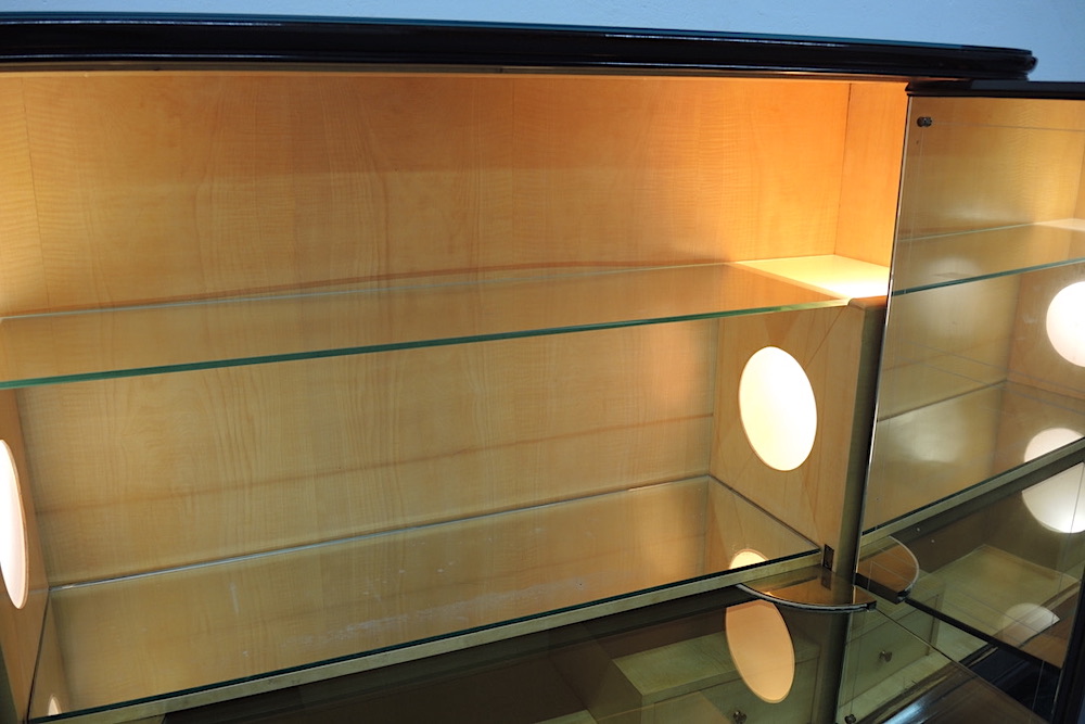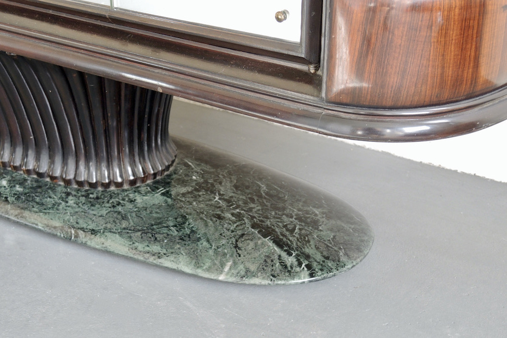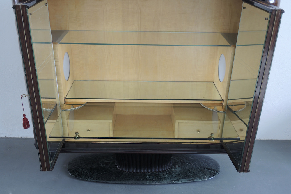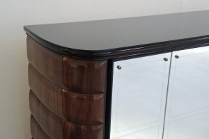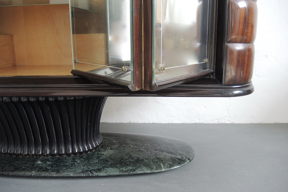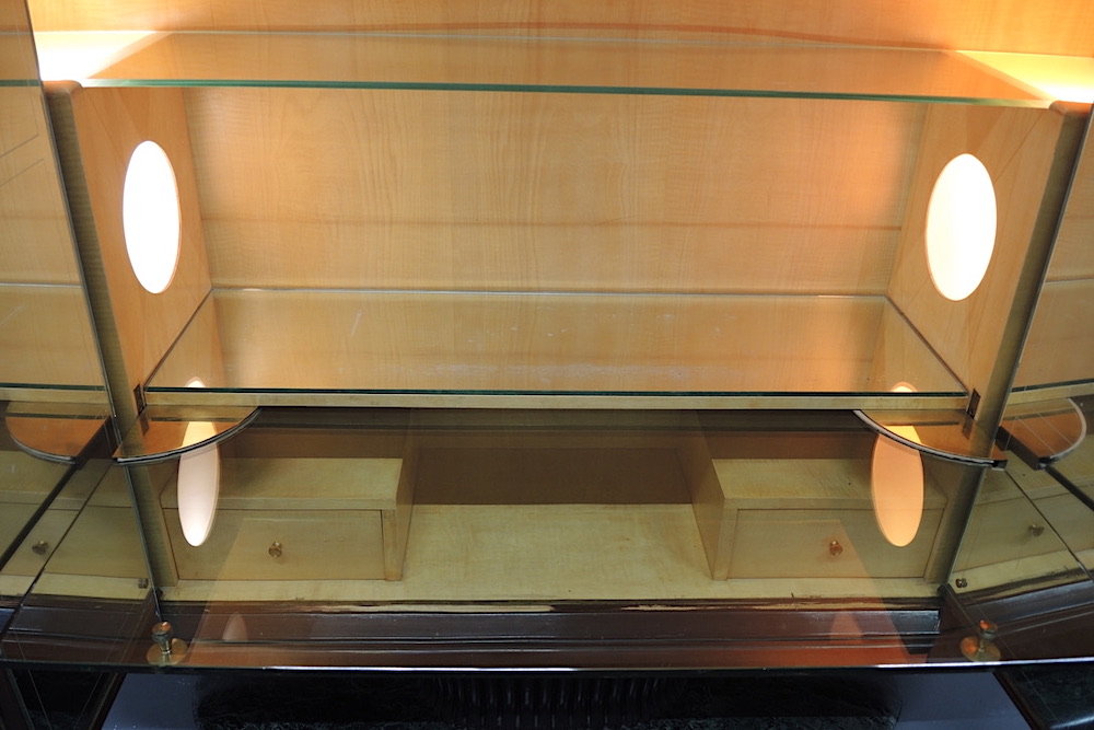 Raro mobile bar realizzato dalla ditta Dassi Milano durante gli anni 40.Mobile di gran qualità costruito su struttura in massello e rifinito in Palissandro.. specchi con decori acidati vetro opalino sul top.Le porte si aprono a soffietto con un interno interamente in acero illuminato con porta in vetro spessa che si apre a ribalta e rimane da appoggio su grosse cerniere in ottone.Misura 153 di larghezza 130 cm di altezza..profondità 45 cm